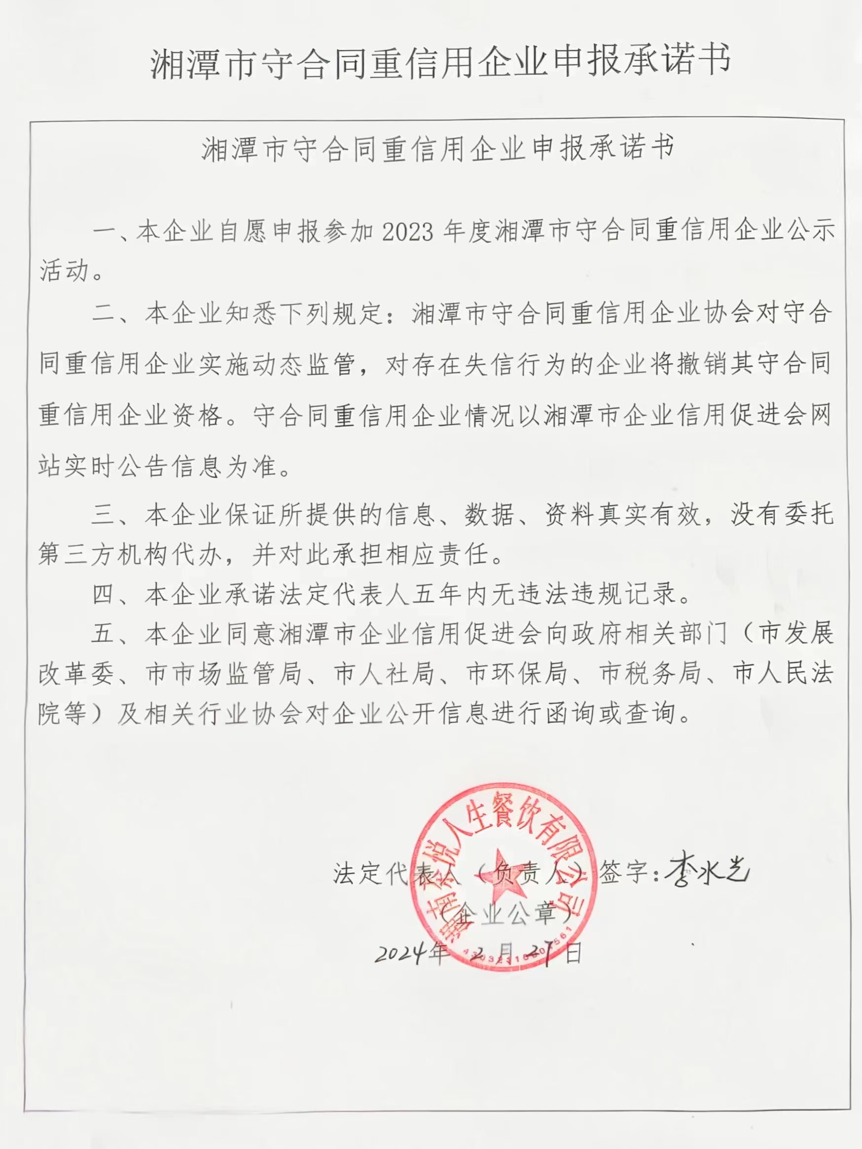本企業(yè)根據(jù)《湘潭市守合同重信用企業(yè)申報(bào)規(guī)定》等編制 2023 年度企業(yè)信用報(bào)告書(shū),并保證本報(bào)告書(shū)內(nèi)容真實(shí)、準(zhǔn)確、完整。