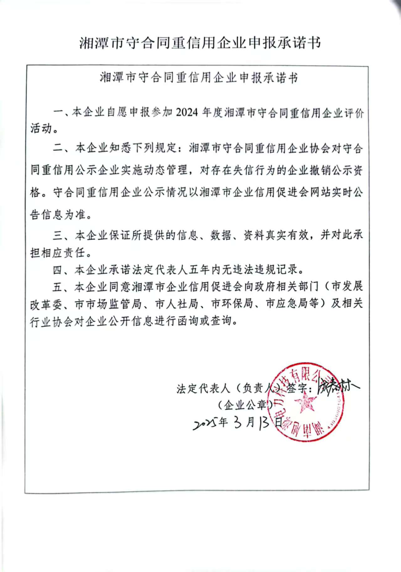 本企業(yè)根據(jù)《湘潭市守合同重信用企業(yè)申報(bào)規(guī)定》等編制 2024 年度企業(yè)信用報(bào)告書(shū),并保證本報(bào)告書(shū)內(nèi)容真實(shí)、準(zhǔn)確、完整。