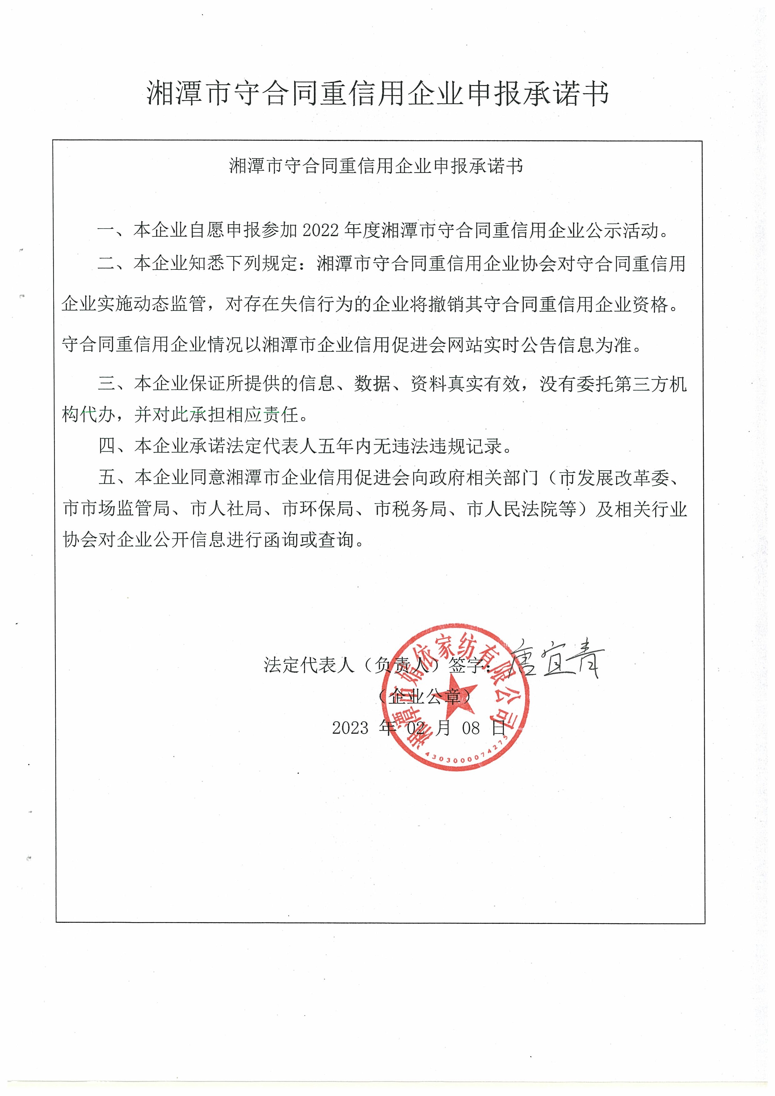 本企業(yè)根據(jù)《湘潭市守合同重信用企業(yè)申報(bào)規(guī)定》等編制 2022 年度企業(yè)信用報(bào)告書(shū),并保證本報(bào)告書(shū)內(nèi)容真實(shí)、準(zhǔn)確、完整。