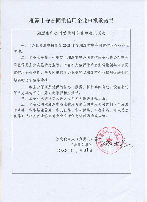 本企業(yè)根據(jù)《湘潭市守合同重信用企業(yè)申報規(guī)定》等編制 2021 年度企業(yè)信用報告書,并保證本報告書內(nèi)容真實、準(zhǔn)確、完整。